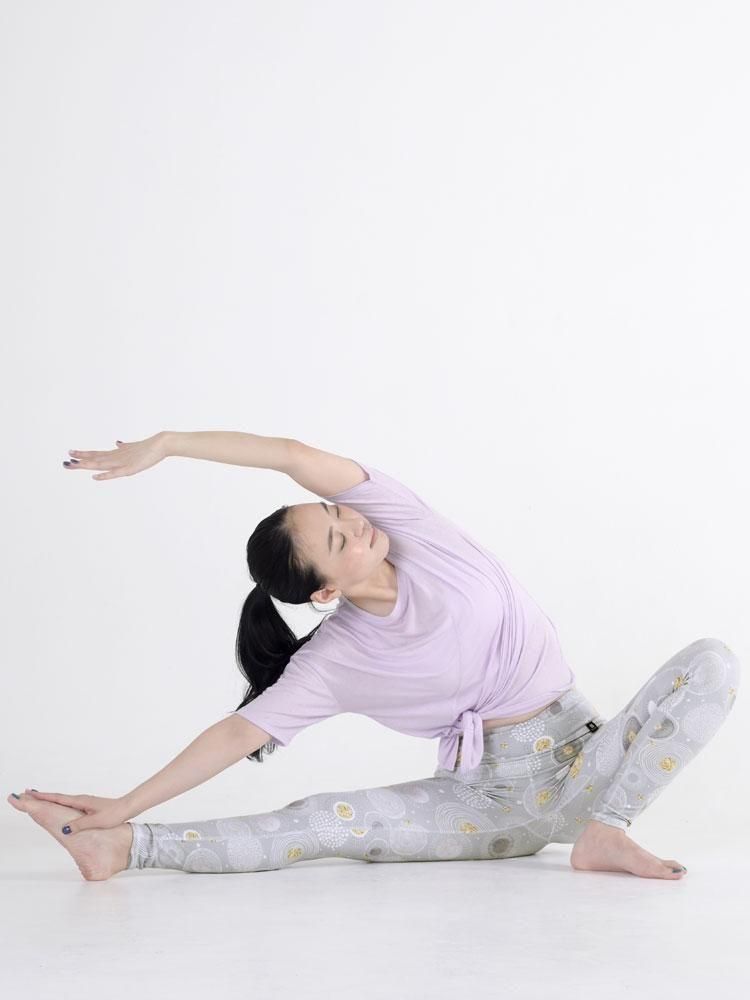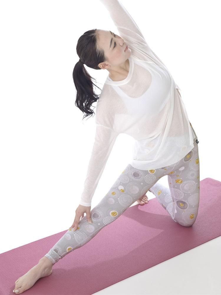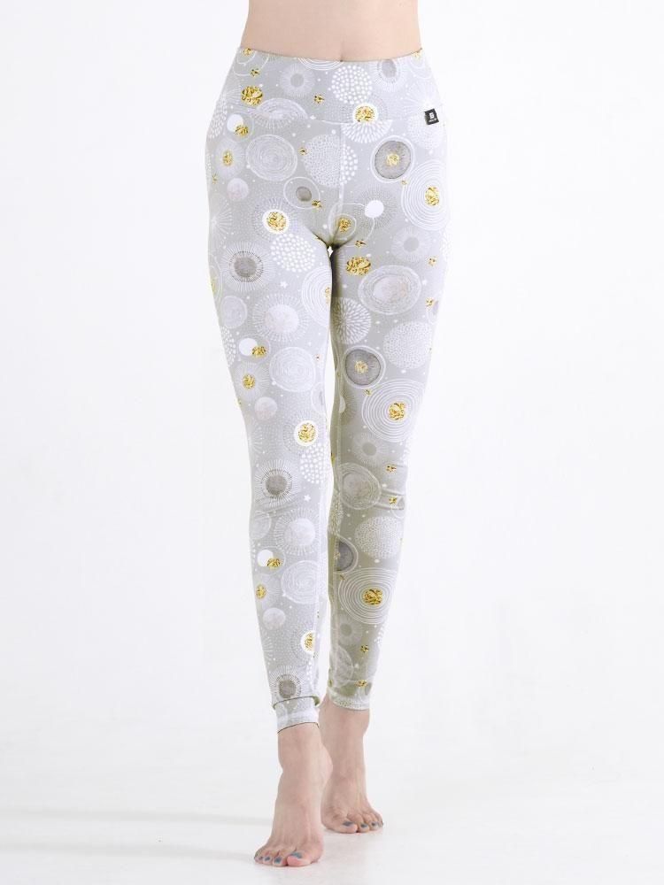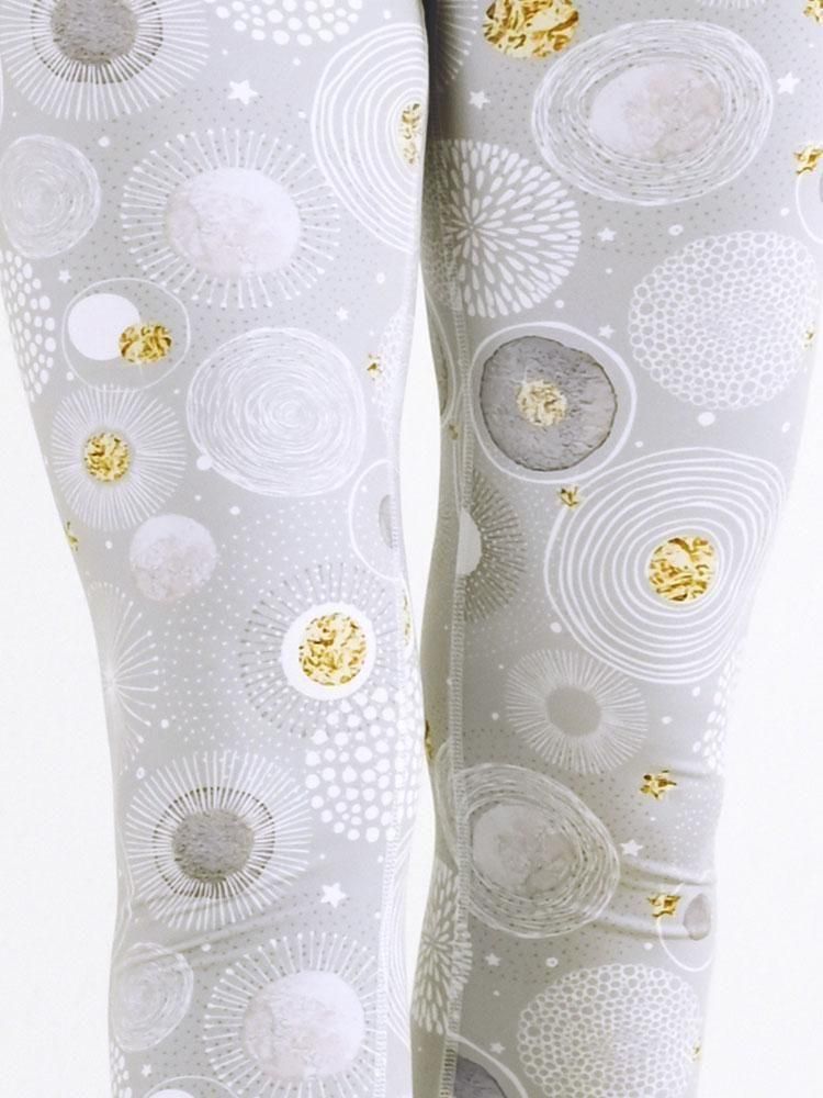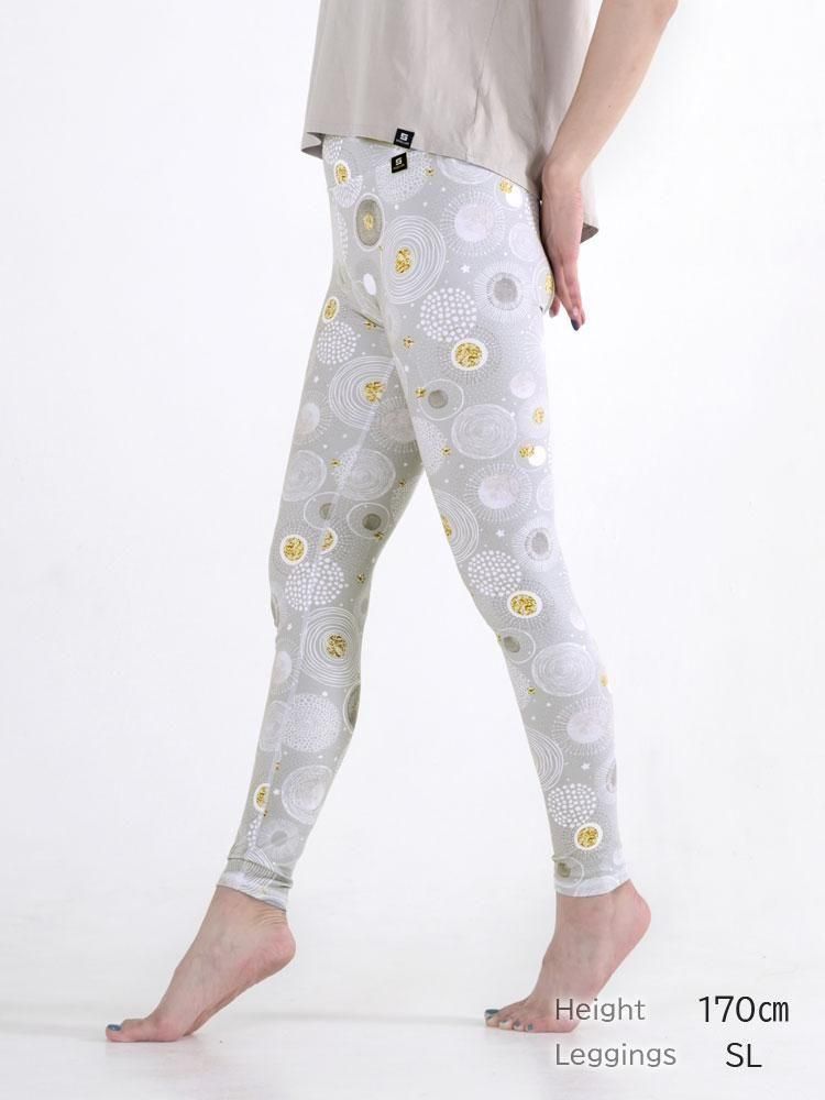 グレーの生地にホワイトでランダムにサークルが描かれたレギンス。水彩のテクスチャーが美しく、所々にあるゴールドもポイント。